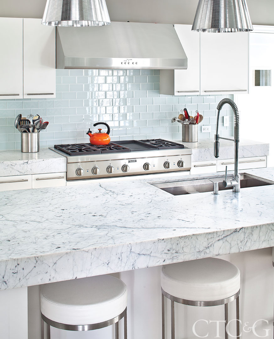 Countertops, PentalQuartz. Fish tank, House of Fins. Pendants, Hubbardton Forge. Backsplash, Artistic Tile. Vent hood, F.A. Porsche. Range, Miele. Chairs, Knoll. Table, Cattelan Italia.