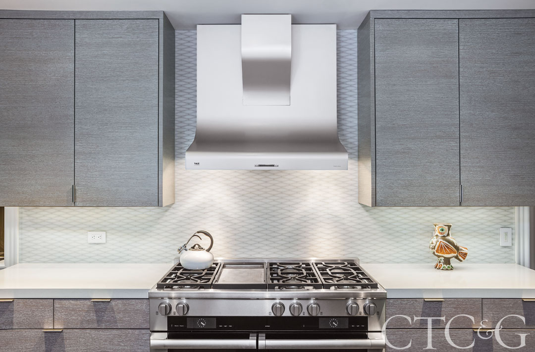 “The Granoffs saw a kitchen in our portfolio that combined finishes and styles that became the directive for this kitchen,” notes Wheelock. “Also, we had a limited-edition exhaust hood with a matte silver automotive finish designed by F.A. Porsche that we took from one of our displays to add a unique sculptural element to the cooking elevation.”