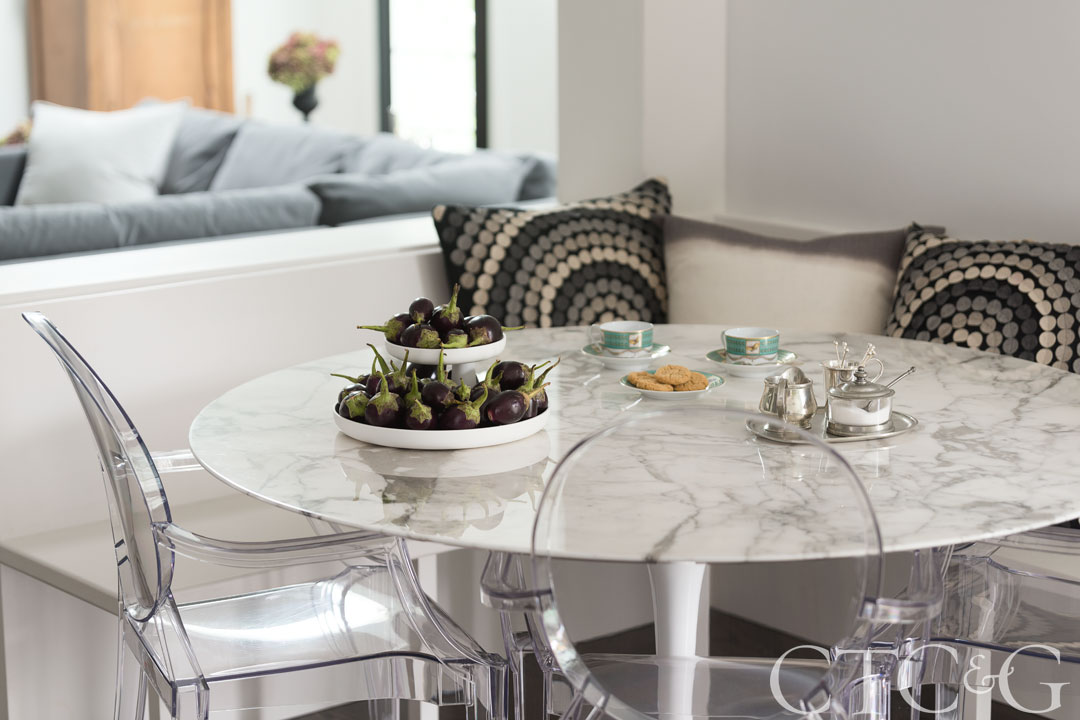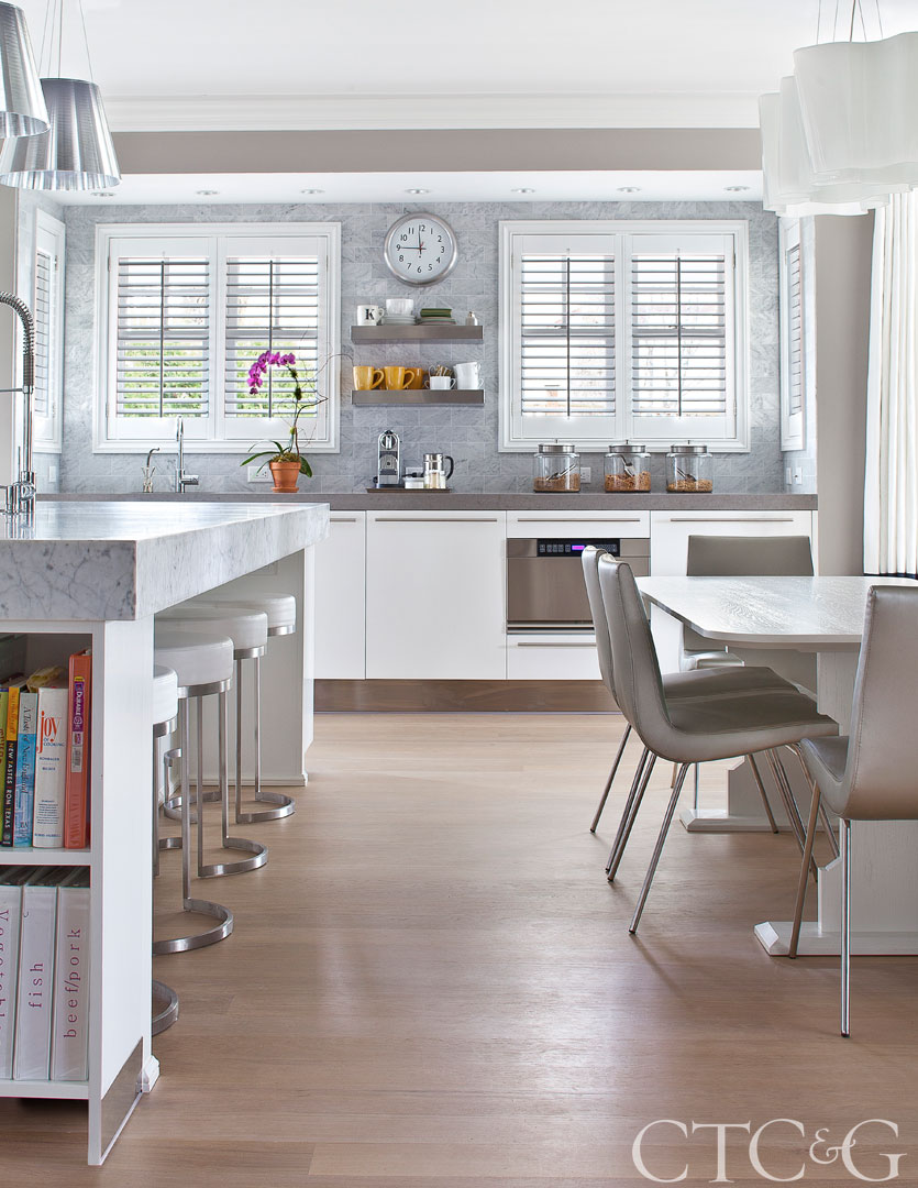 Cabinetry, Poggenpohl. White countertops, Cambria. Gray countertops, Neolith. Chairs and stools, Philippe Starck. Table, Eero Saarinen. Light fixture, Leucos.