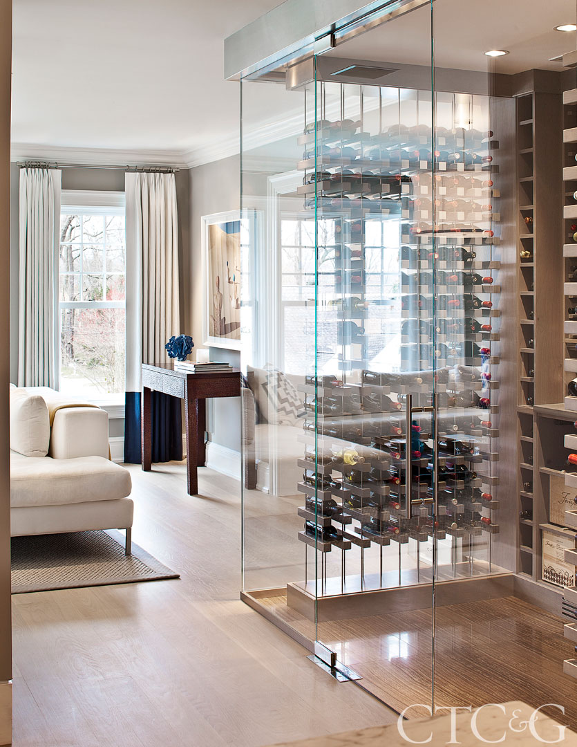 A wine-storage cube straddles the space between the kitchen and living room reinforcing an air of sophisticated informality. “I planned the wine storage area as a space that could be lived with and appreciated as art,” says Soper. “I thought it would have the most impact as a glass cube, allowing the bottles to be appreciated three dimensionally. It was the ‘project within the project’ that makes the kitchen unique.”