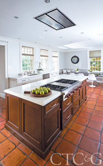 To help brighten the space, three custom, double-hung windows were installed and a new lighting plan was devised, sans pendant lights. “We wanted the kitchen to speak for itself architecturally, and pendants would stop your eye,” notes Graham Veysey of Good Bones Design, who collaborated with Adams on the project. To avoid having a hood above the island blocking sight lines, Adams introduced a state-of-the-art, ceiling flush-mounted venting system that is controlled on the island.