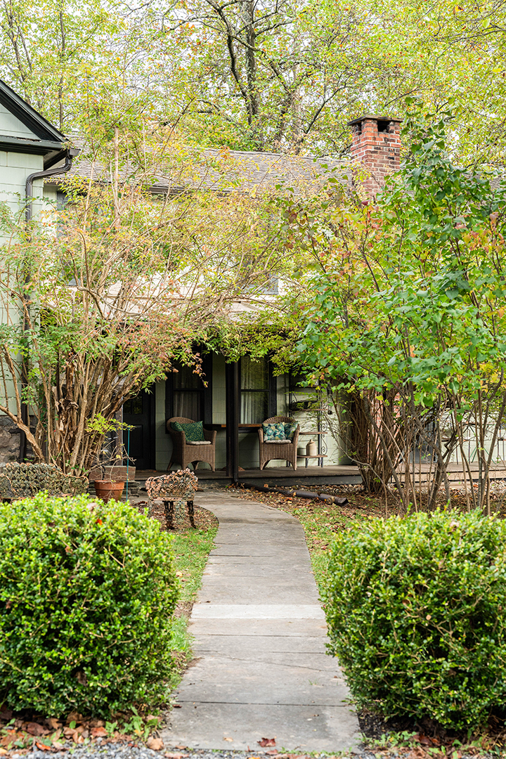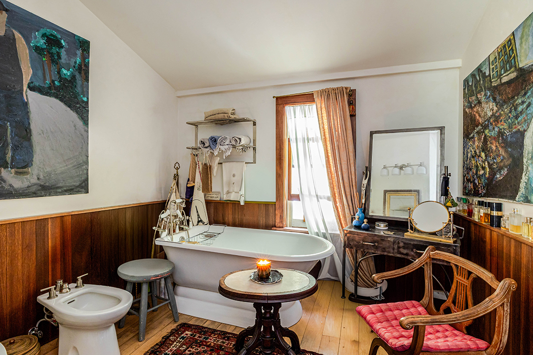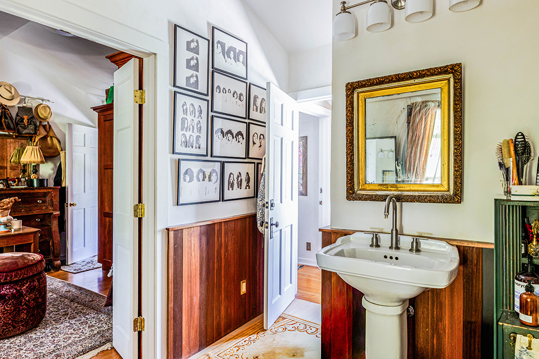 The interiors have a quirky, eclectic aura that nods to the home’s groovy, golden era. Laidback and cozy, the vaulted living room ideal for gathering or songwriting is anchored by a wood-fired stove–not your typical suburban fireplace, but one that lends the space a more rustic and storybook feel. A mix of old and personal elements appear throughout, from the dramatic, dark-lit chef’s kitchen to lime-washed walls and hardwood that compliment one another, creating a richly lived-in texture. An unexpected modern perk comes in the form of a cedar sauna, proving once again that this property isn’t cookie-cutter. Plus, it could provide the future owner with a place to unwind between recording sessions.
