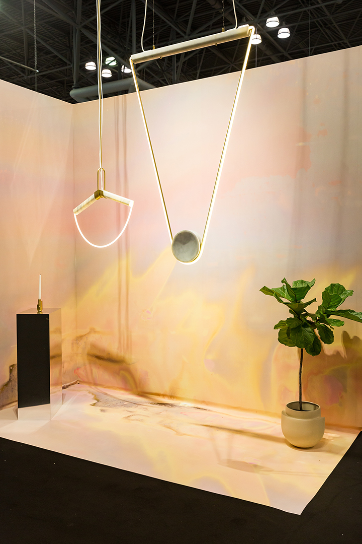 Wallpaper Projects, a boutique design studio specializing in custom-fit, high-end, featured a fun collection of self-adhesive and pasted wallpaper. For ICFF with Collective Concept, Wallpaper Projects worked with Farrah Sit and created wallpaper with fiery washes of golden hues that rise from the fully covered floors to surround suspended stone and neon lights. Silver Studies is a wallpaper collection from experimental chemical paintings on photographic paper. This unique creative process expands into environmental murals that are custom scaled for individual projects. –Serena Norr, Digital Content Director of C&G Media Group