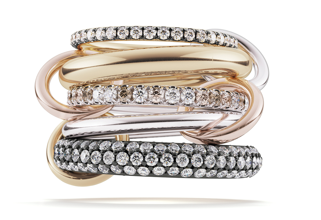 Nexus Ring by Spinelli Kilcollin, five linked rings in silver, black rhodium plated silver and 18k yellow gold with micro-pave gray, cognac, champagne and white diamonds mixed with silver and gold connectors. Approx. 3.2 TW. Available at Vincents Fine Jewelry. Priced at $8,000. 914.235.5000 / vincents-ny.com