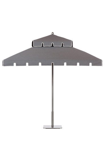 SANTA BARBARA UMBRELLA brings new shades of gray to the great outdoors. Perfect poolside or deckside, the DoubleDecker Umbrella shown in Charcoal with natural-trim keyhole valance is available in more than 100 color combinations. Frame in Slate powder-coated aluminum. Santa Barbara Umbrella I 800.919.9464 I sbumbrella.com