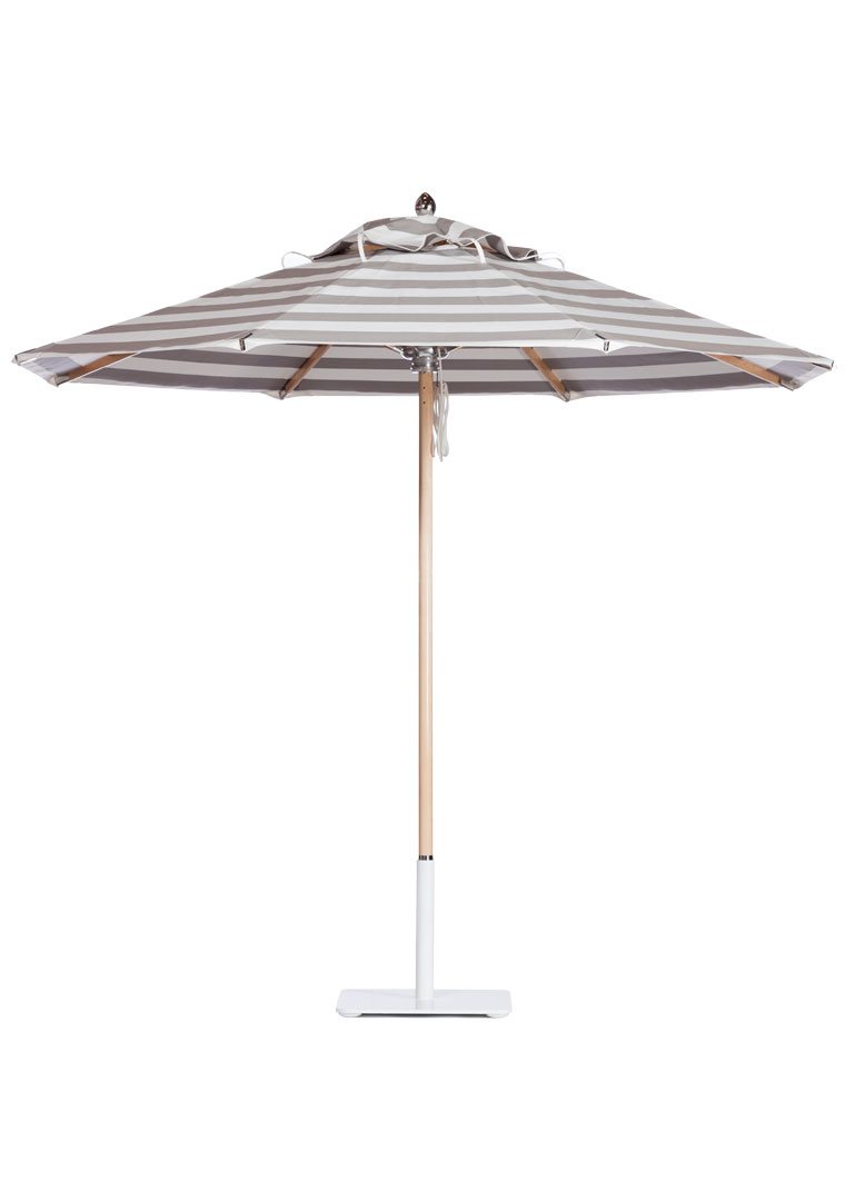 with a new 9 foot octagonal shaped umbrella in Cabana Gray and white, with solid maple pole, stainless steel