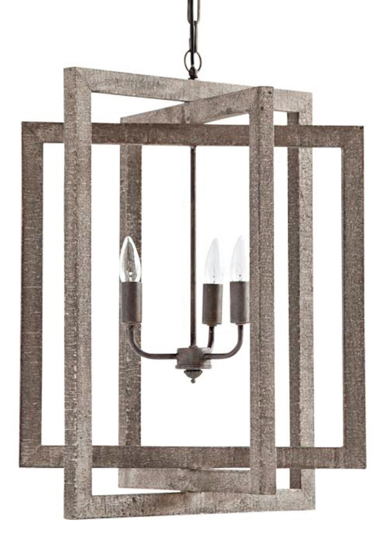 Modern and beachy, this wooden lighting fixture is accented with industrial metal for a casual yet sophisticated look. Available at Renee’s in Mattituck.