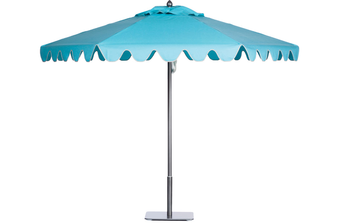Santa Barbara Umbrella brings the Arabian Nights home with this stylish, Marquis valance. Shown trimmed in gray on the popular, Paseo Aluminum umbrella in Aqua Sea. Available in more than 100 color combinations. Shade-protect in style.