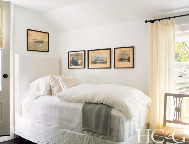 The serene, cozy master bedroom features a headboard from Restoration Hardware, an antique French settee, and a vintage American Windsor chair. Restoration Hardware