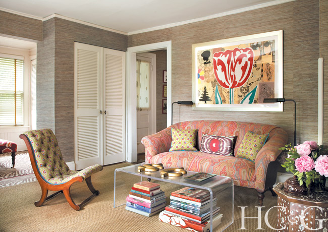 In a corner of the living room, an antique English armchair, covered in a Muriel Brandolini fabric, sits beneath a whimsical family photograph. The grass-cloth wall covering is by Kravet.