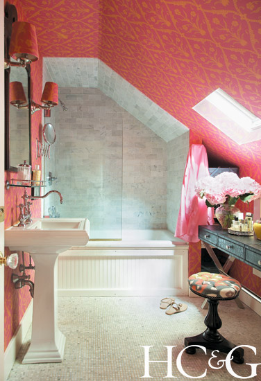 A David Hicks for Cole & Sons paper lines the walls of the master bathroom. The vintage piano stool is covered in a Schumacher ikat; the pedestal sink is by Kohler.