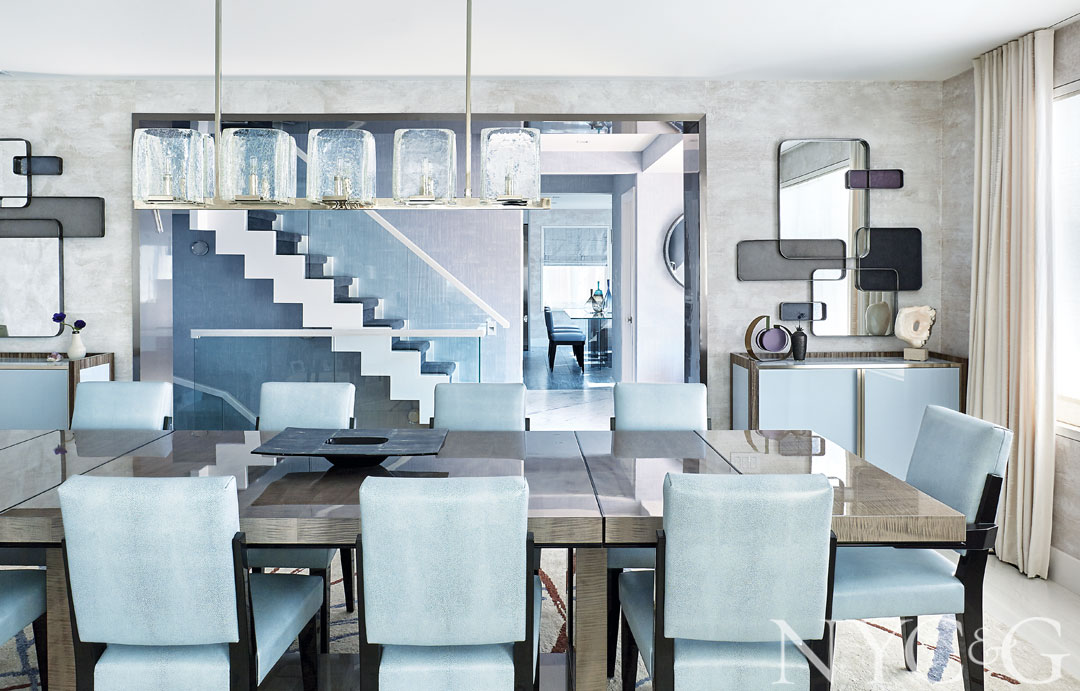 Decorator Jenny Kirschner designed the mirror in the dining room, one of a pair, with overlapping leather, hide, and suede tiles. The buffet’s doors are painted a custom Benjamin Moore hue.