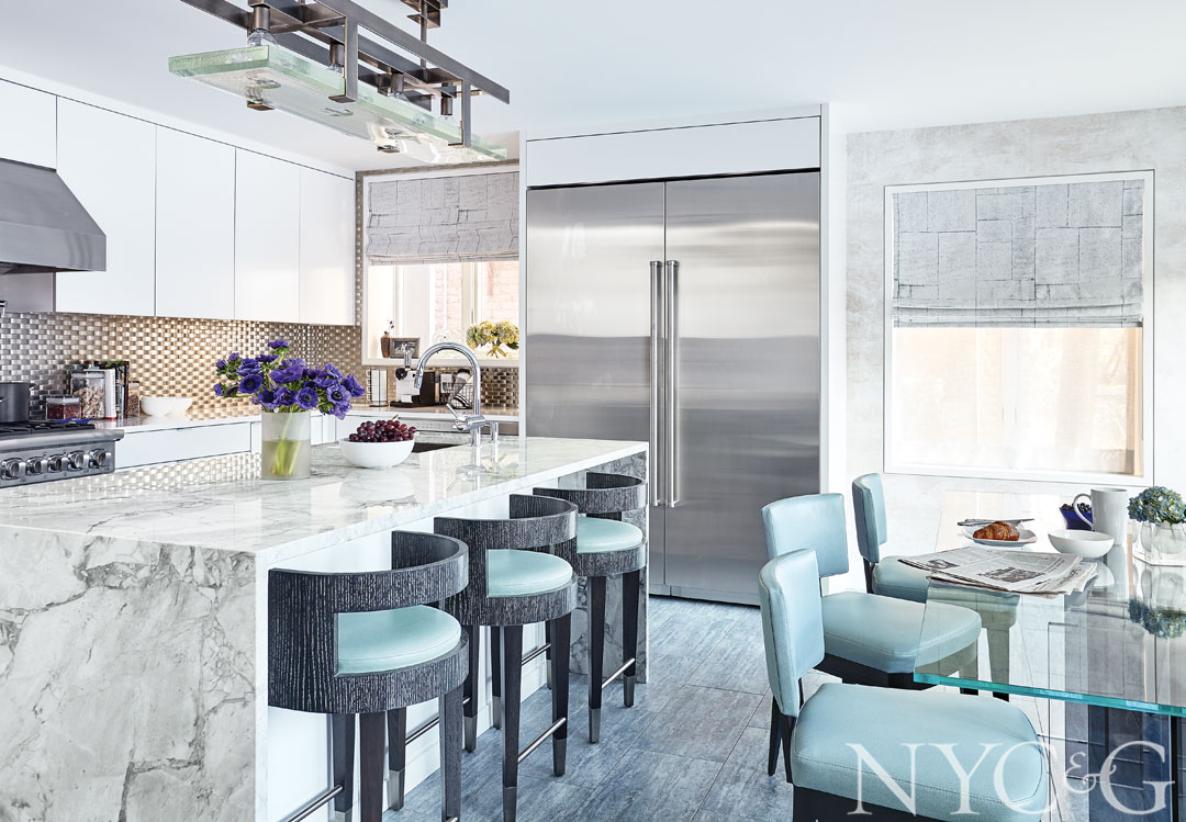 The kitchen includes Robert Marinelli–designed stools, a Roche Bobois Diapo dining table, and an island made of quartzite from ABC Stone. The range and hood are Viking and the faucet is Grohe.