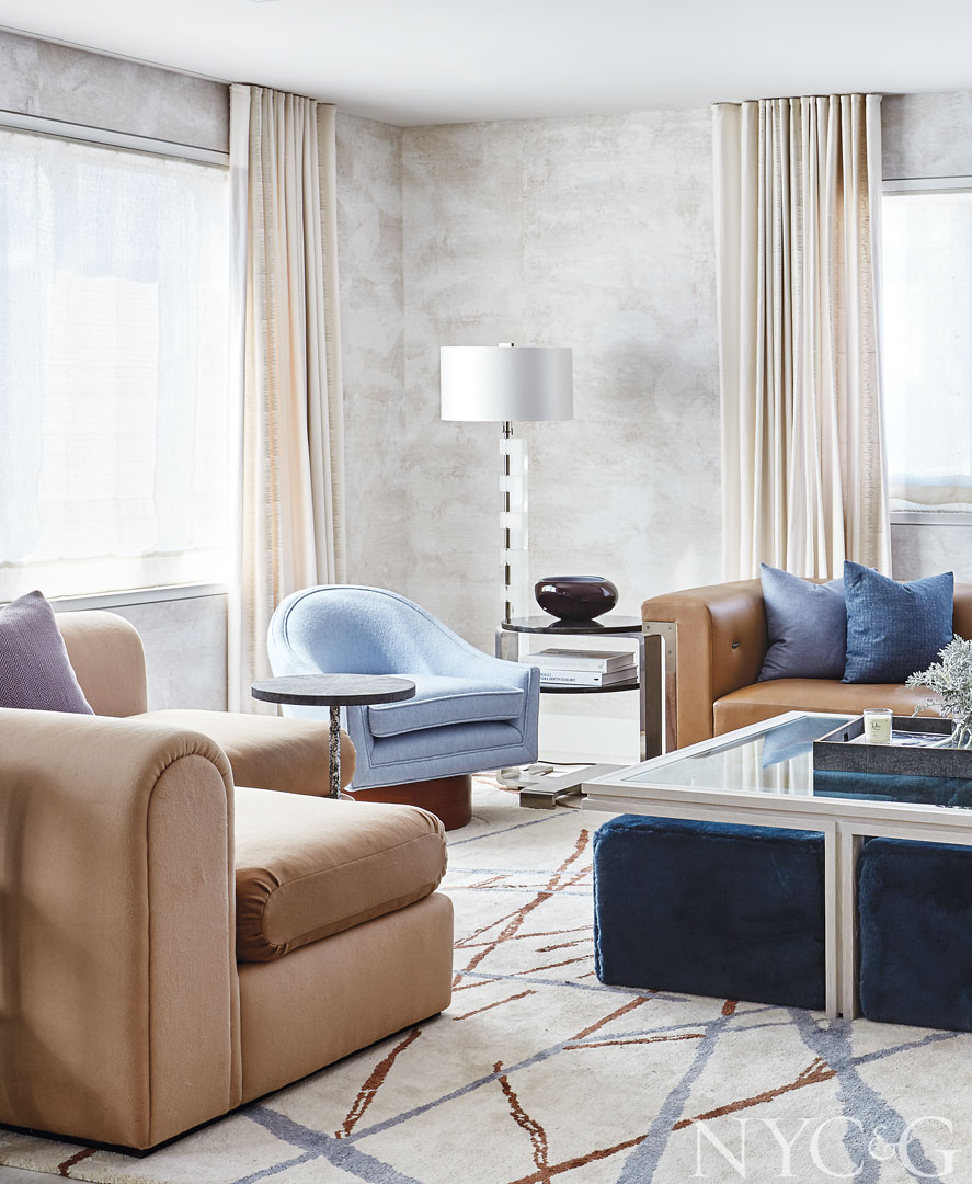 The living room is furnished with a Donghia sectional, a Holly Hunt sofa, and a vintage Harvey Probber–designed armchair. The area rug is a Kelly Wearstler design for the Rug Company.