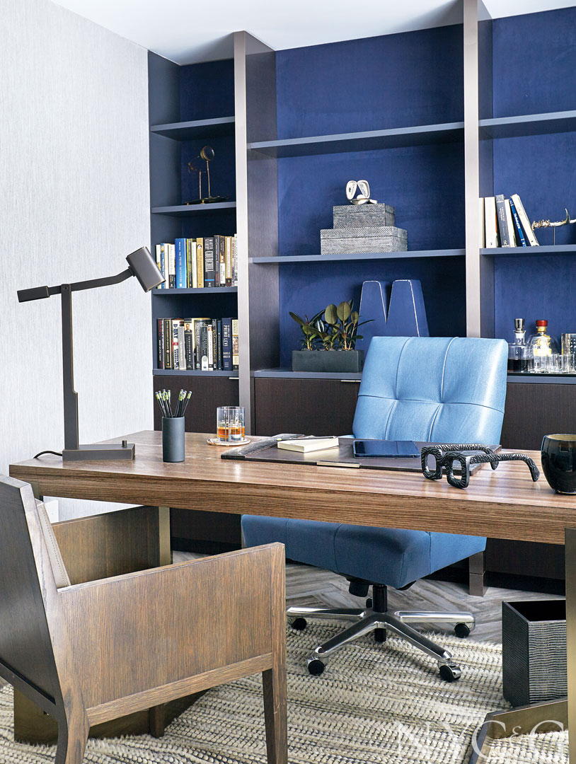 The custom shelving unit in the study is backed in a Phillip Jeffries suede; the tufted chair is from Donghia.