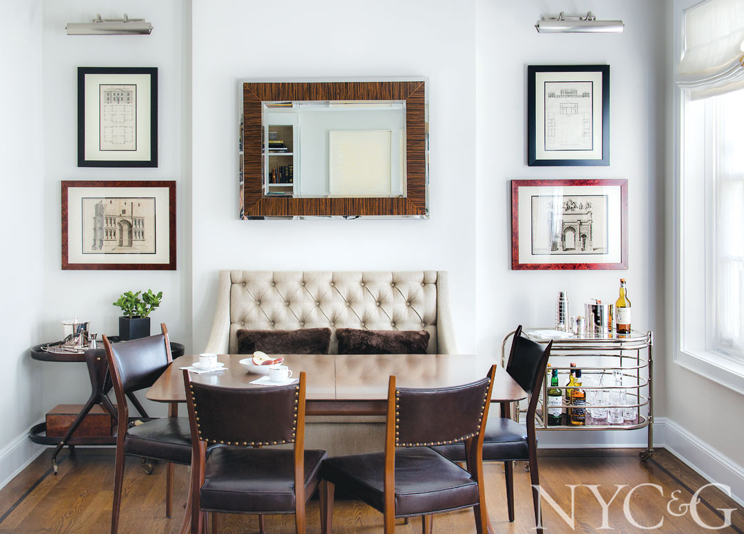 In the dining area, circa-1950s Paul McCobb chairs, reupholstered in a Dualoy leather, and a tufted banquette from Room surround a T. H. Robsjohn-Gibbings dining table, which is flanked by a vintage walnut Aldo Tura–designed bar cart and a polished nickel Ralph Lauren Home bar trolley. Architectural drawings, some of which date from 1719, hang above.