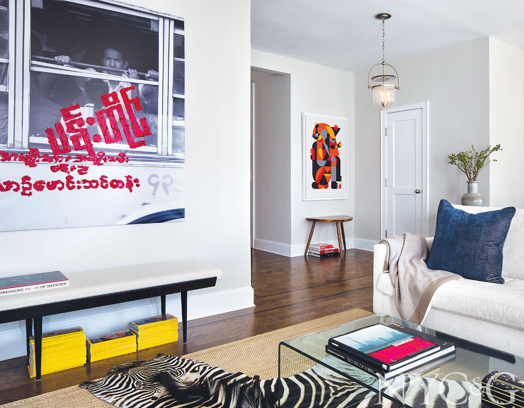 An acrylic on vinyl artwork from Myanmar is displayed above a vintage bench; the ceiling pendant is from the Urban Electric Co.