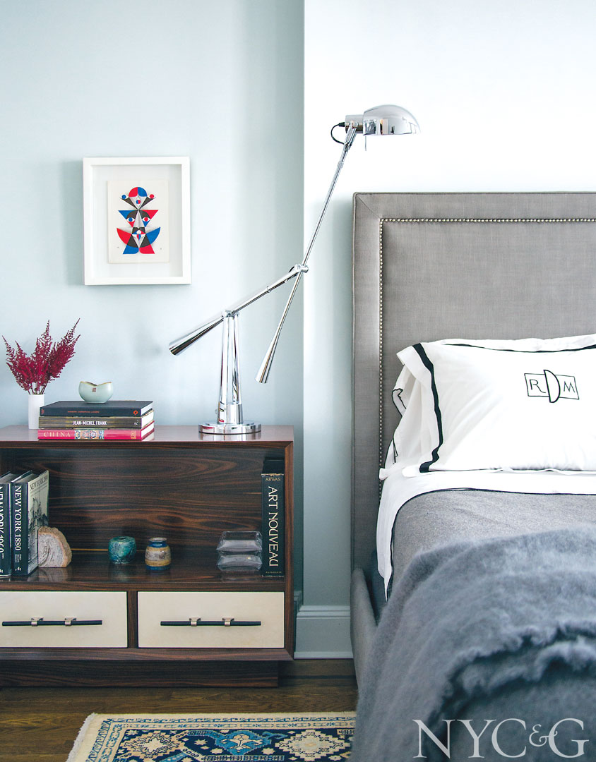The master bedroom includes an RH bed frame, and a Ralph Lauren Home bedside lamp.