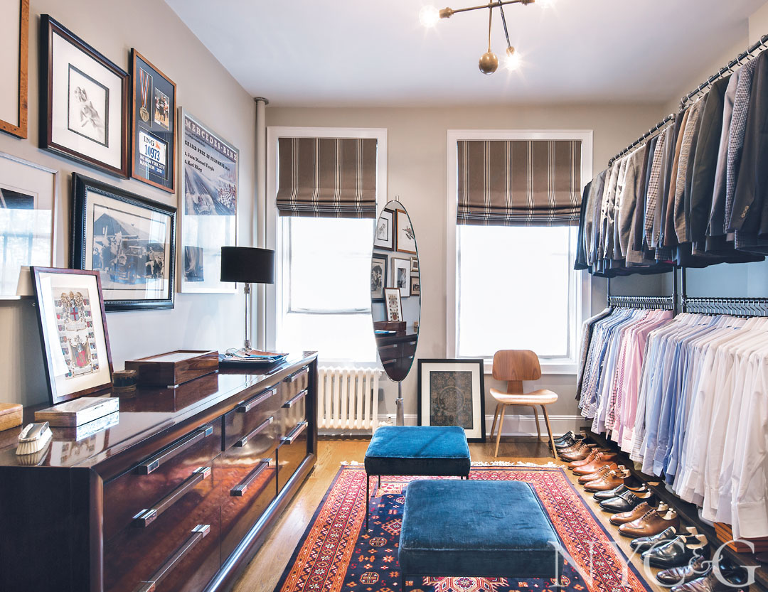 Formerly a second bedroom, the custom walk-in closet and dressing room is outfitted with a vintage Indian rug, Paul McCobb stools, and an Eames lounge chair.