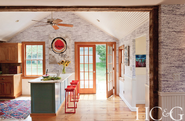 Not far away from Lurker’s place, just a few hundred feet from the Atlantic on a quiet lane in Amagansett, a renovated circa-1900 home has been an inspiring canvas for artist Perry Burns and his wife, Jolie Parcher, who owns Mandala Yoga. After purchasing the house in 2003, Burns was hands-on in its renovation. “We’re both creative people and love taking on projects that we can make into our own,” says Burns, who employed multiple materials and textures throughout: cement and/or brick countertops, walls, and benches, as well as colorful hanging sconces and chandeliers that look like giant floating gems. The couple also added the requisite yoga studio with views of the ocean off the master bedroom.