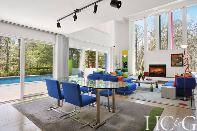 While traveling back and forth from his house and studio when nature calls has been an inconvenience of sorts, Lurker has enjoyed three decades of creative life on the East End, though he and his wife have recently decided to move to Spain, listing their four-bedroom, three-bathroom home on two acres with Sviatlana Karnei of Douglas Elliman for $2.9 million. Bright pops of color appear throughout the all-white house—such as the tangerine Sub-Zero fridge and a blue cooking grill on the deck. “Color is an expression of joy, and my artwork incorporates a lot of it,” says Lurker, whose work is included in the collection of the Museum of Modern Art. “Most people who visit say, ‘You cannot be unhappy here!’” There’s a reason he calls it the Playful House.