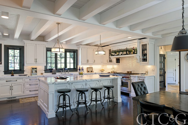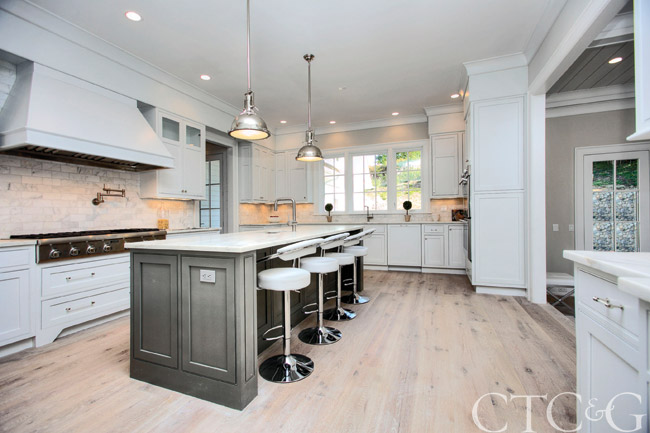 The next stop on our kitchen tour takes us to Compo Beach in Westport, where a brand-new, 9,100-square-foot home has one of the most welcoming kitchens we’ve seen. The open-plan space offers restaurant-quality amenities, including a six-burner stove, a marble-topped island with a pot-filler sink, and stone backsplashes. It’s flanked by a breakfast room for casual meals and a more formal dining room with coffered ceilings and a butler’s pantry. The kitchen also opens onto a spacious family room with a chic stone hearth and two walls of French doors accessing handsome terraces. Come spring, the outdoor spaces make for fabulous entertaining with fireplace, stone loggia and pool. Sue Lieberman of the Riverside Realty Group in Westport has the $5,295,000 listing.