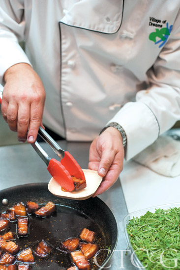Bite-sized morsels of crispy pork belly get a sweet glazing of Madava Farms maple syrup.