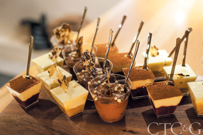 Desserts: verrines of red fruit compote and mascarpone cream, pineapple and vanilla compote with lemon sabayon, chocolate mousse with crunchy pearls and bitter chocolate nips.
