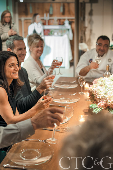 A toast before the meal by Rena Shapiro with Ken Shapiro, Heather Malsin, pastry chef Jerome Vidal.