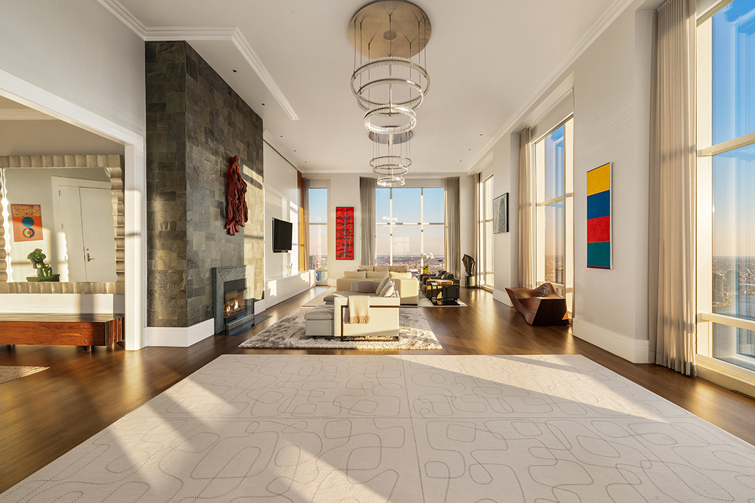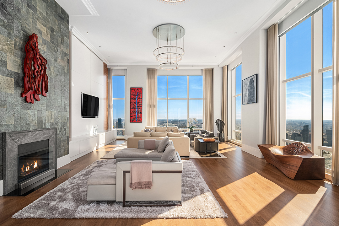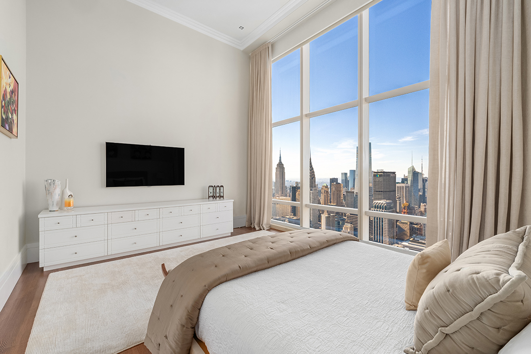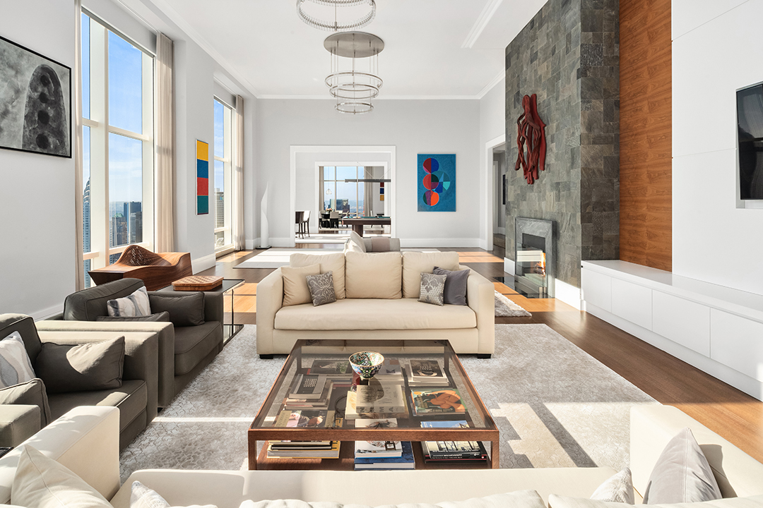 Entering the penthouse, you’re thrown right into the heart of the home and the center of the unit’s glamour. Open spaces offer an immediate 79 feet of window frontage, 16-foot ceilings, a grand contemporary fireplace, and a myriad of spots for relaxing or hosting. The views are astounding with landmarks like the Chrysler Building and Empire State Building appearing like friendly neighbors.