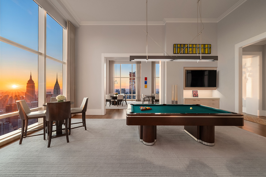 All in all, the NYC home boasts highlights like four bedrooms, a gourmet kitchen, a spa-like primary bathroom, and a custom-paneled home office. The building offers white-glove service from staff such as doormen and concierges, and amenity spaces like a health club, spa, pool, dog park, and more.