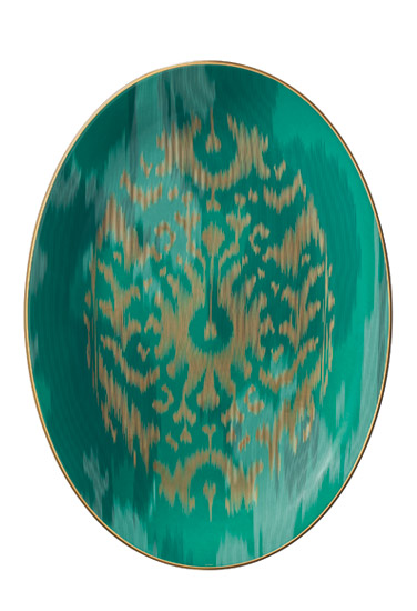 The just-unveiled Voyage en Ikat tableware collection from Hermès takes its inspiration from precious stones and far-flung places. Consider this emerald-toned oval platter, crafted of porcelain and rimmed in 24k matte gold. $2,140, 691 Madison Ave., NYC, 212-751-3181, hermes.com