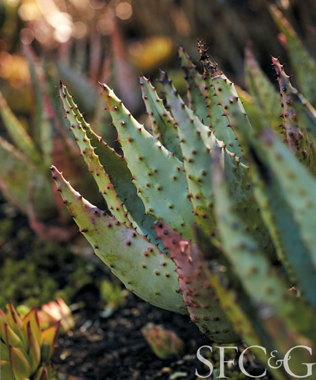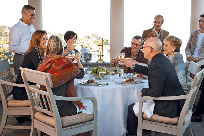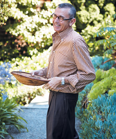The property’s terraced garden also registers as an extension of the home’s restorative nature. Wiseman maintained its original plan, but winnowed spaces for contemplative pauses and added perches for taking in the stunning, unobstructed vistas: Sausalito and the Golden Gate Bridge are to the west; Angel Island and the Bay Bridge to the south. A long path meanders through tiered beds of aloes, multi-headed succulents and clumping, fan-shaped palms to Wiseman’s herb garden, where he picks sorrel, fraises des bois and other delights for the leisurely Sunday afternoon lunches he often prepares for friends and clients.
