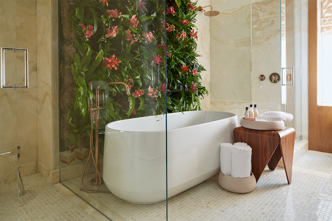 1. The outdoors are making their way in. Achieve a seamless indoor-outdoor connection by incorporating lush greenery throughout the home—especially the bath. Bring in plants that are bathroom and shower-friendly for a spa-inspired feel like peace lilies, aloe, and snake plants. The live plant wall from MagnaFlora in the Marcia Tucker Interiors Kips Bay Decorator Show House master bathroom serves as a peaceful backdrop to the sweeping, organic lines of the Veil Trough vessel bathroom sink and rose gold accents from Kohler.