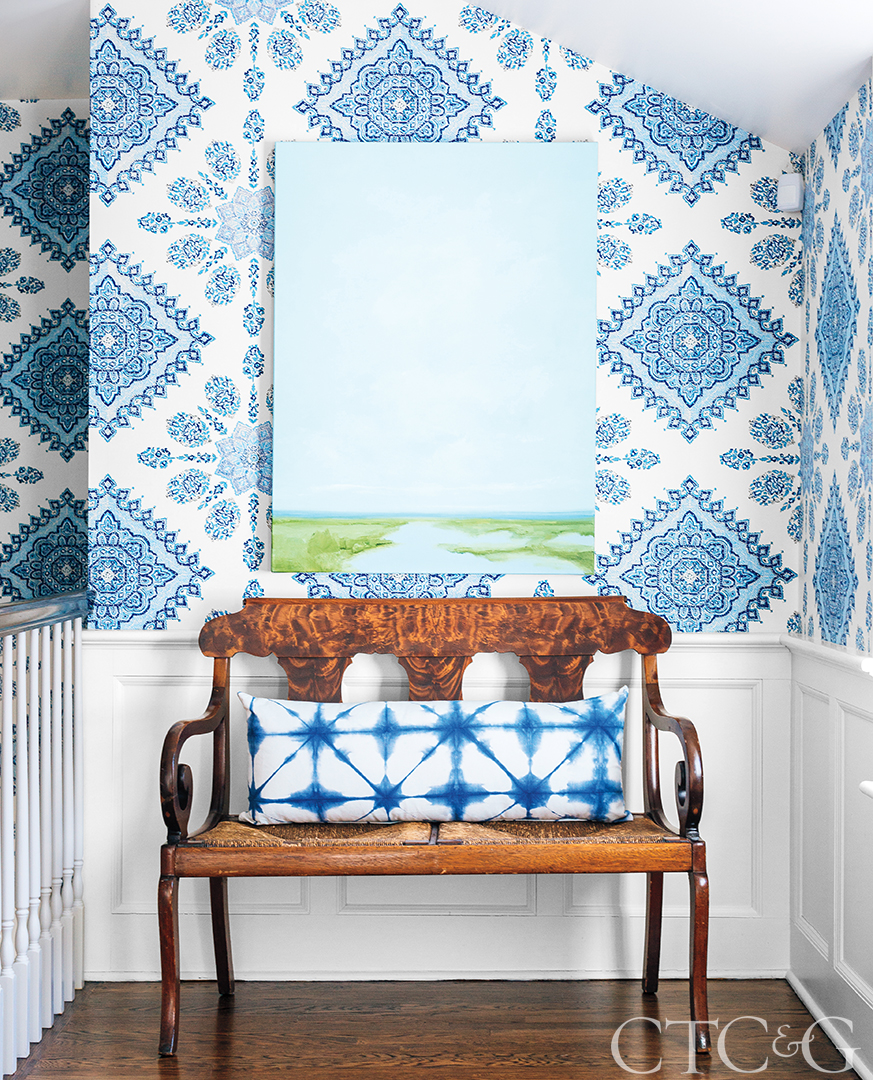 Even in areas of the home that might otherwise be purely transitional, such as a nook in an upstairs landing, Johnson encourages visitors and family members to linger: An antique burl-wood bench from a local antiques store is adorned with a tie-dye pillow; the painting is by Dani Renchard.