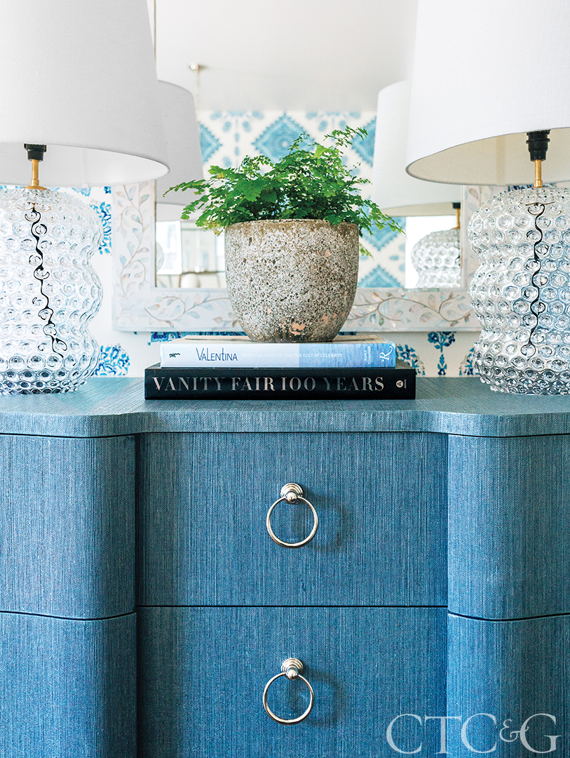 For an upstairs landing area, Johnson created a kind of tableau, including a grasscloth chest from Bungalow 5, a bone-inlay mirror from Serena & Lily and a pair of vintage lamps.