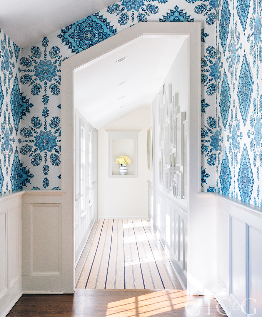 Hallways in designer Mia Johnson’s own home are defined by Quadrille’s Persepolis wallpaper.