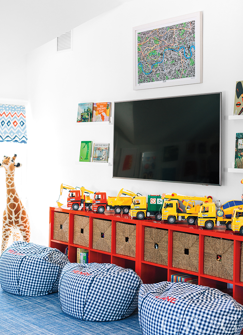 Elements in a playroom, to which all of Johnson’s children gravitate, include Pottery Barn beanbags and Ikea bookshelves and bins.