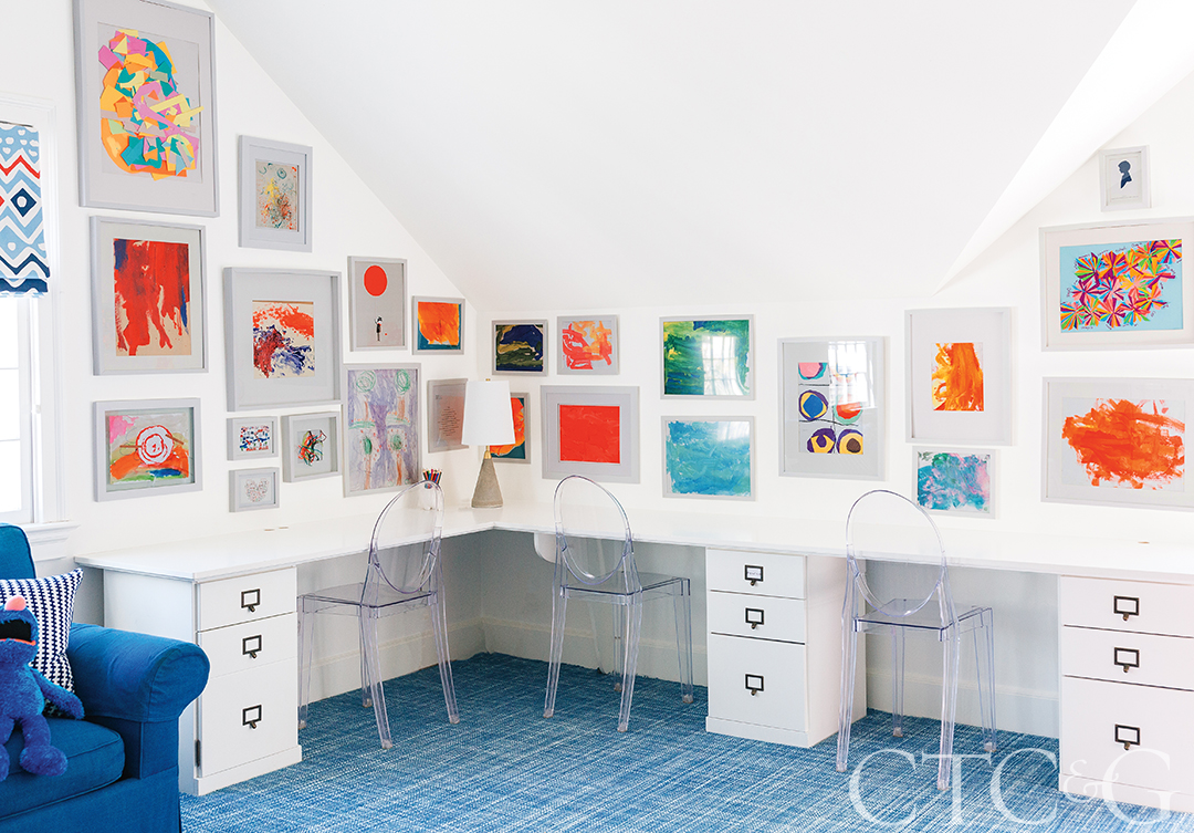 The playroom is bright and cheery with plenty of wall art.