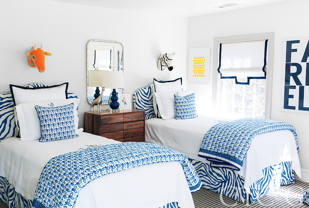 One of the children’s rooms includes custom zebra-striped headboards and bedskirts.