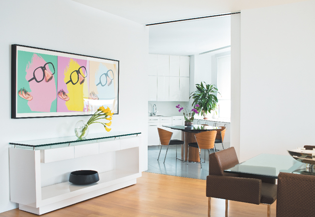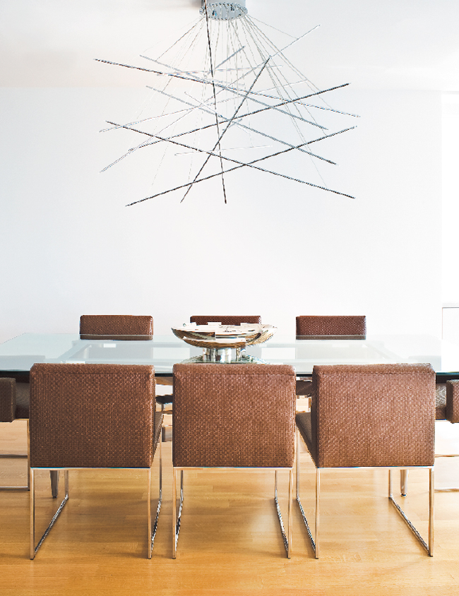 Artful Abode | In the dining area, a work by John Baldessari hangs above a console that came with the apartment. Diaz-Azcuy designed the chandelier and reupholstered the chairs in a brown woven leather from Joseph Noble.
