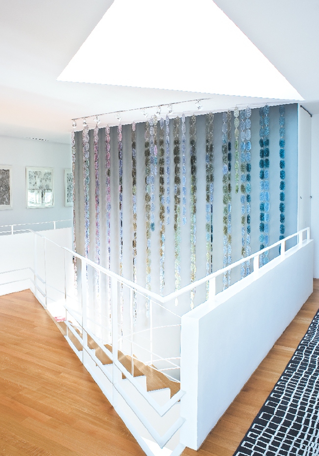 Glass Act | A 1970s Vistosi glass “curtain” shimmers against a wall that Diaz-Azcuy painted a light charcoal, lending dramatic impact to the main stairway linking the upper and lower floors. The wool and silk runner, based on a traditional Moroccan rug design, is by Edward Fields.