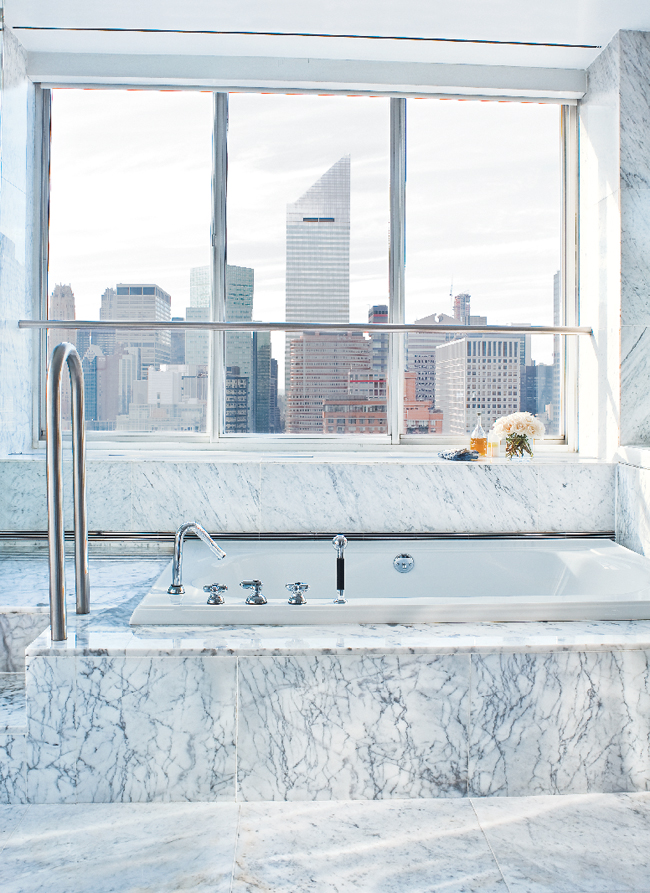 Unparalleled Views | The circa-1982 apartment’s all-marble master bath looks out on an era-appropriate variety of postmodern towers such as the Citigroup Center, the Lipstick Building, and the Sony Building.