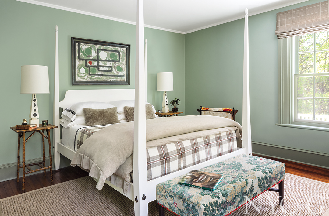 Darryl had a wealth of ideas for the interiors, too, but wavered over which direction to follow. “At one point I wanted super-Colonial, with bright green and yellow rooms, and then I was inspired by the early 1900s and envisioned a red dining room,” she explains. “Eventually, I realized that none of it was true to how we live our lives.” She ultimately settled on a modern-day version of a rarefied relic, working principally with muted colors. For instance, a guest bedroom is painted a tranquil green, while another is awash in soft yellow. “I intentionally chose shades that looked like they had dulled over time. It was my way of nodding to the past without trying to re-create it.” In the dining room, she commissioned Cape Cod–based folk artist Charlie Munro to create an immersive lifelike canvas depicting the home and surrounding landscape, which he then affixed to the walls. The piece includes roaming deer and horses and charming details, such as Darryl’s initials carved on a tree trunk.