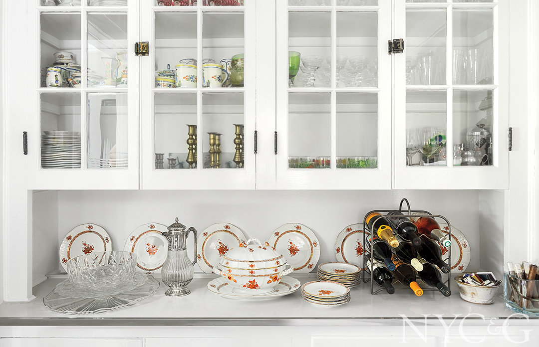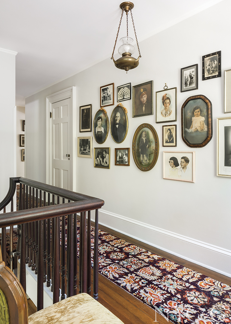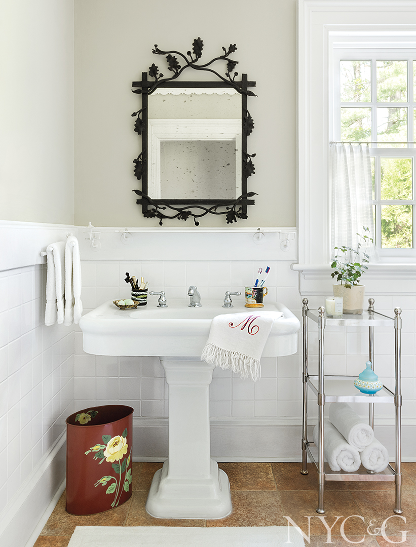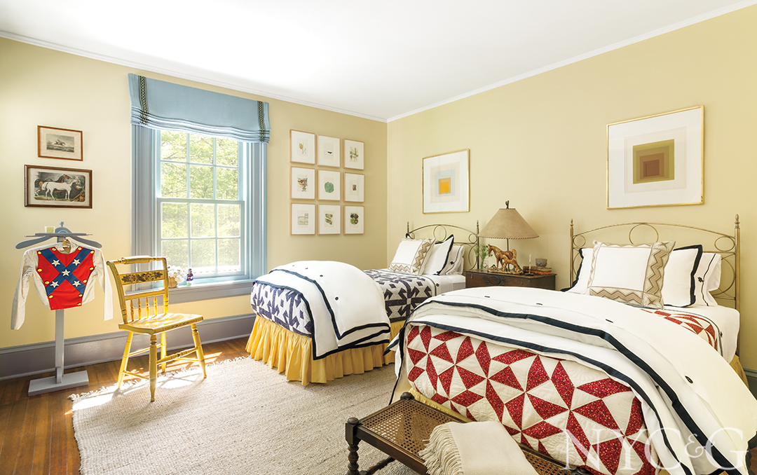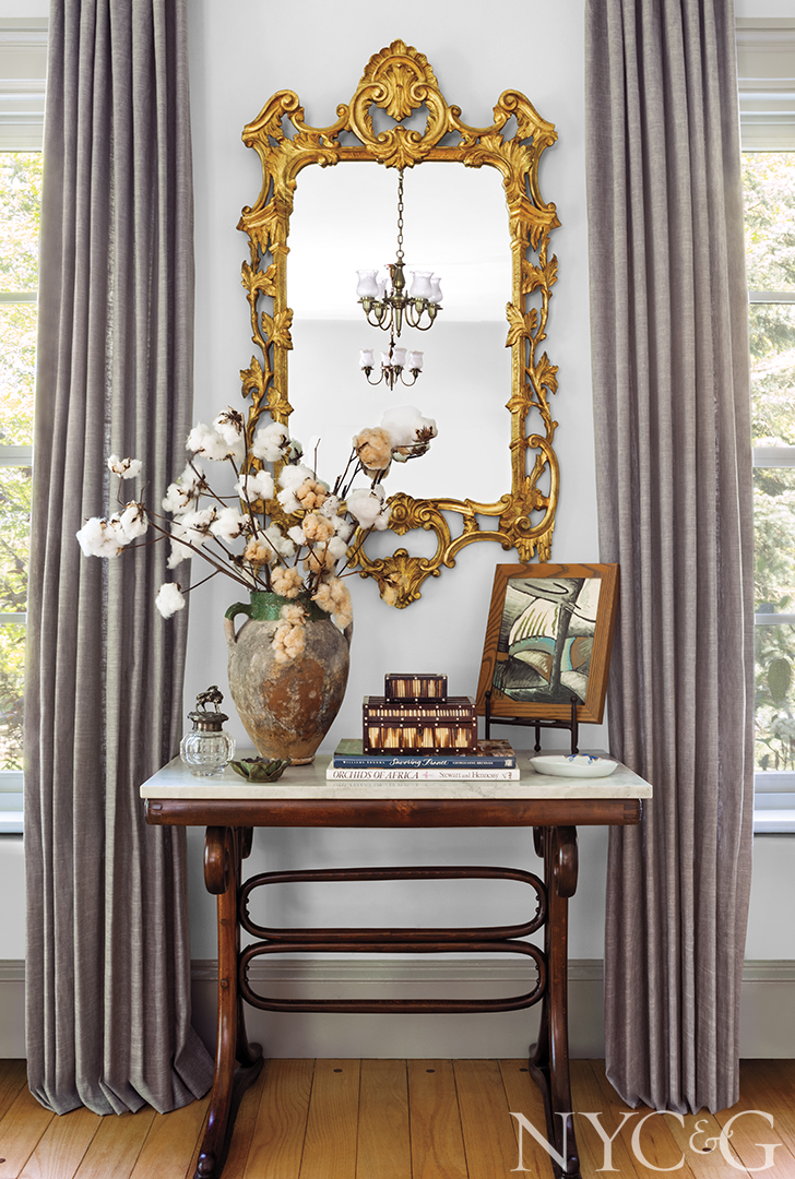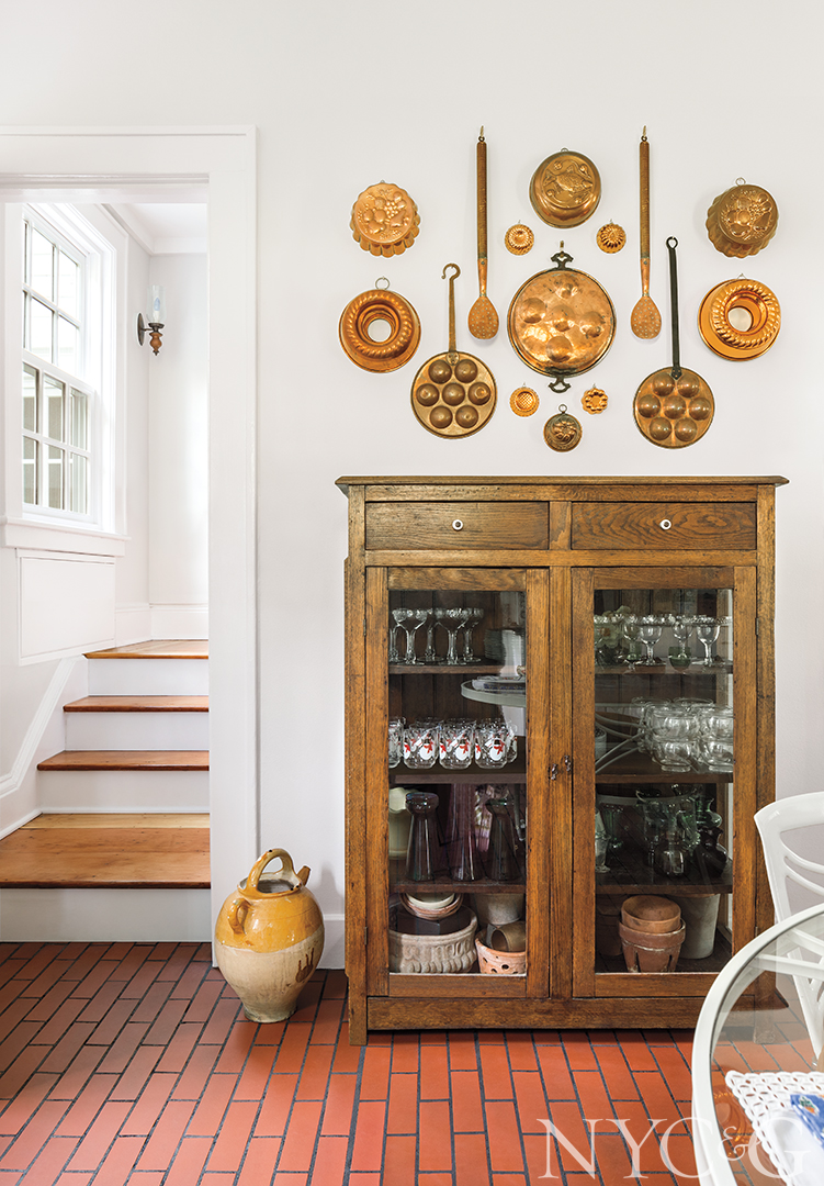 For Darryl, a highlight of the 18-month-long renovation was the day a truck arrived from her native Texas packed with antique and vintage furnishings. Inside, family heirlooms from three generations commingled with objects that she had saved from childhood jaunts to local flea markets. Among the especially treasured pieces are a seascape that used to hang above her grandmother’s living room fireplace and now resides in the same location in Darryl’s abode. Brass bed frames and handmade quilts, also formerly her grandmother’s, are right at home in a guest room, along with a marching band uniform, once proudly worn by her uncle and displayed in a corner.
