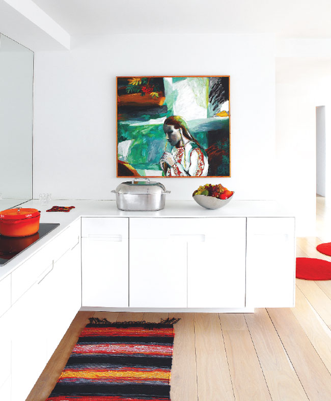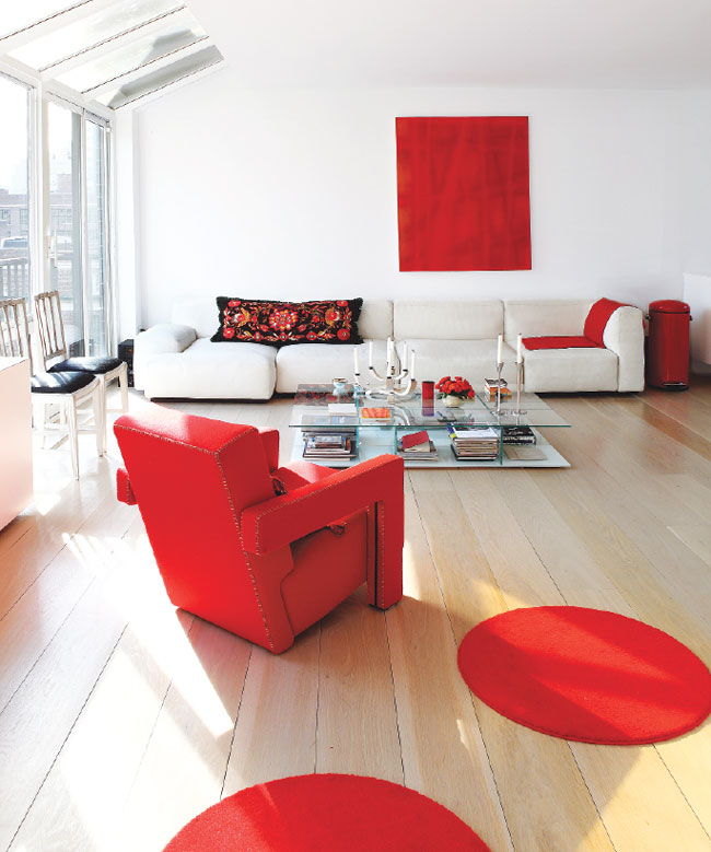 A white linen Piero Lissoni sofa anchors Cecilia Dupire’s living room, which is otherwise accented with vibrant pops of red: a custom linen needlepoint pillow by Lena Eklund, an oil painting by Magnus Carlén, circle rugs from Ikea, and a felt Utrecht chair by Gerrit Rietveld. The chairs by the windows are circa-1800 Swedish antiques.