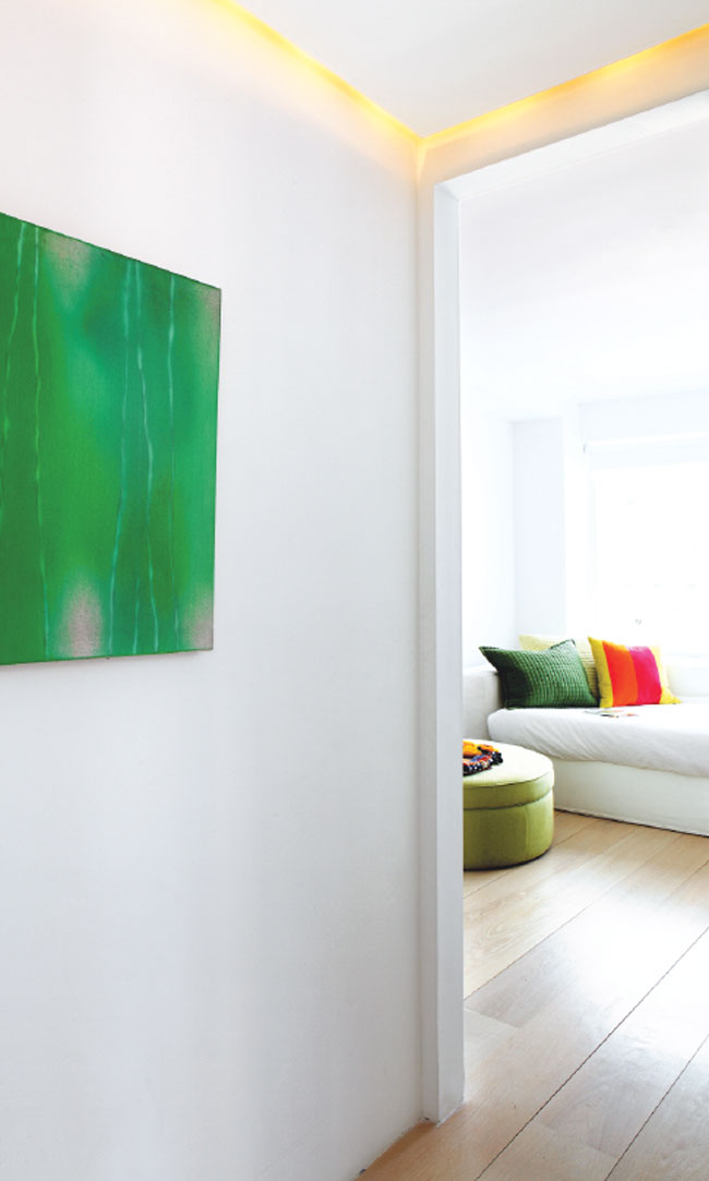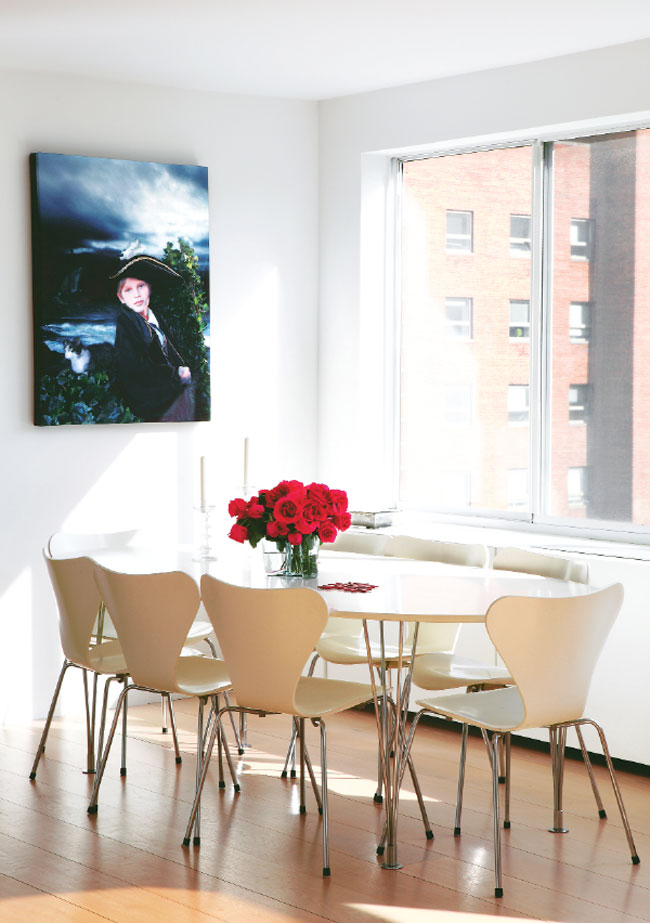 In the dining room, the white powder-coated Bruno Mathsson table and Arne Jacobsen Series 7 chairs are from Fritz Hansen; the glass candlesticks are from Iittala.