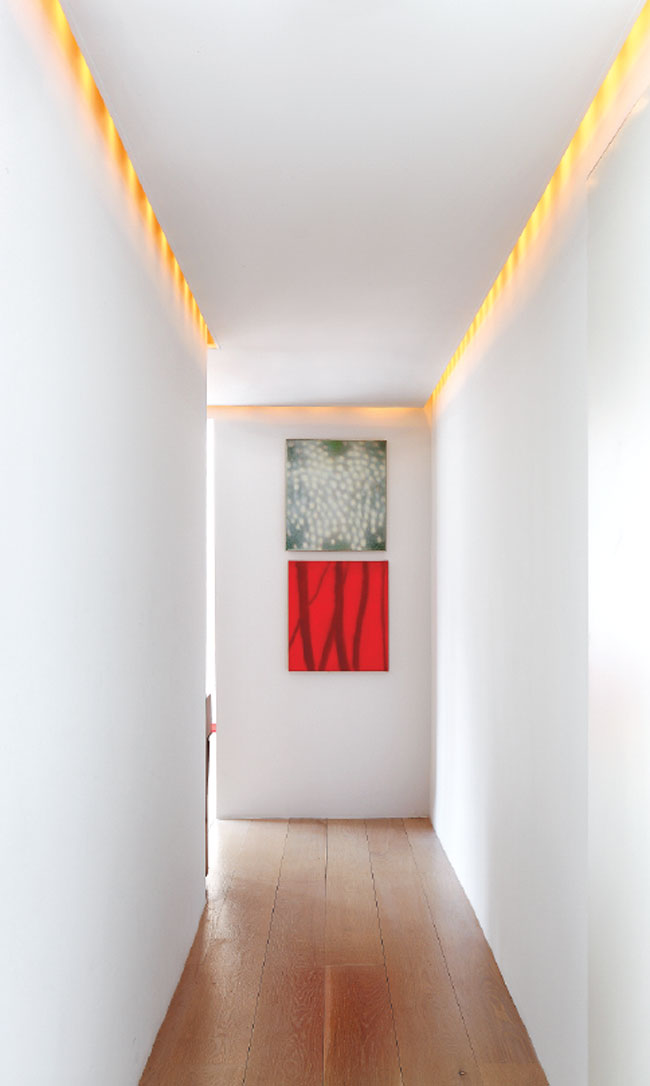 Oil paintings by Magnus Carlén hang in the hallways, which feature recessed lighting and original wide-plank floors.