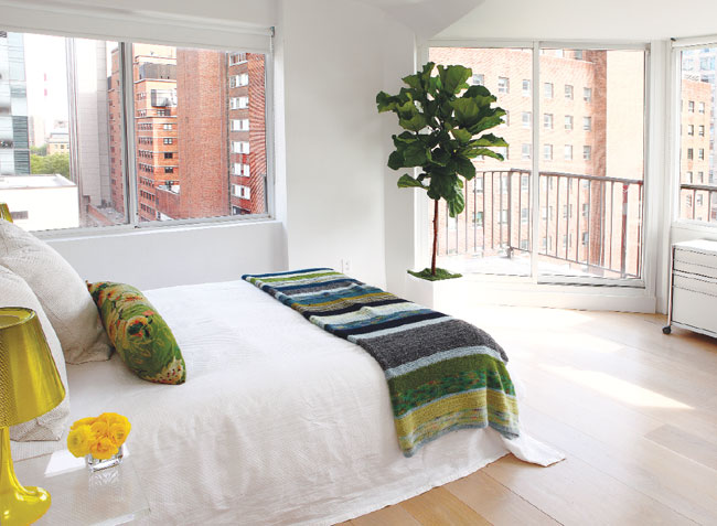 In daughter Julia’s room, a Philippe Starck lamp sits on a Lucite table from CB2. The white cotton bedding is from Frette and the green accent pillow is from Pottery Barn.