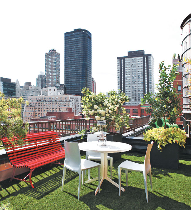 The sitting area on the lush rooftop terrace includes a white café table from Crate & Barrel, Bellini chairs from Design Within Reach, and an aluminum red bench from ABC Carpet & Home.